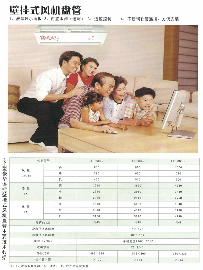 我公司生產的壁掛式風機盤管與國際流行款式同步的外觀設計,美觀大方。換熱器采用無縫純銅管串套高效雙向鋁翅片脹一體,熱傳導效率高,冷熱交換充分。電機采用無油滾動軸承,配合新型離心風輪和低噪聲風道,運轉平穩,寧靜。配新型遙控器,能操作自如,得心應手。