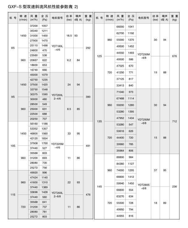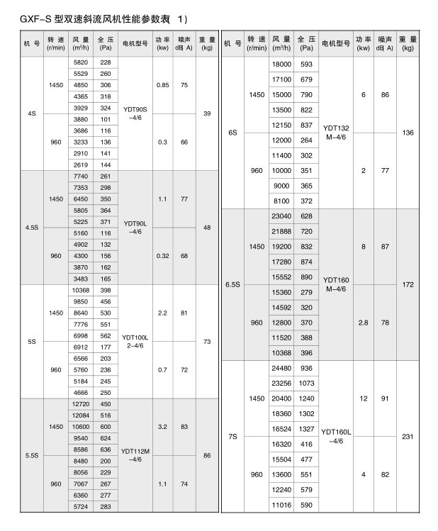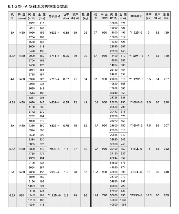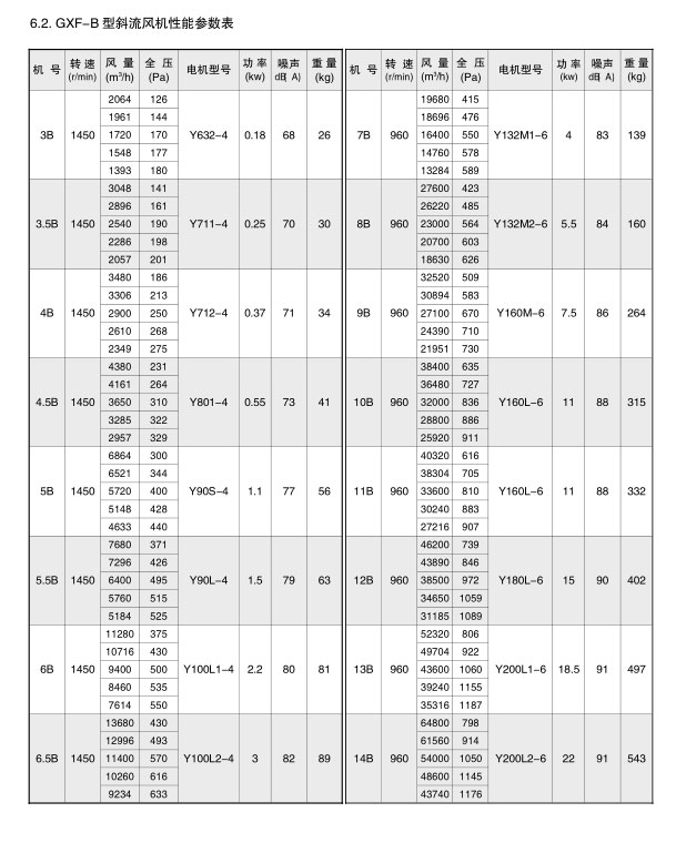 GXF系列斜流通風(fēng)機(jī)按葉輪直徑分為400-1400mm十四規(guī)格,按類(lèi)型分為A、B、C、S四種類(lèi)型,共五十八個(gè)機(jī)號(hào)。風(fēng)量由3000-90000m3/h,全壓由185-2500Pa;這樣就給設(shè)計(jì)部門(mén)和用戶(hù)單位提供了充分的選擇條件,具體數(shù)據(jù)請(qǐng)查風(fēng)機(jī)性能參數(shù)表。