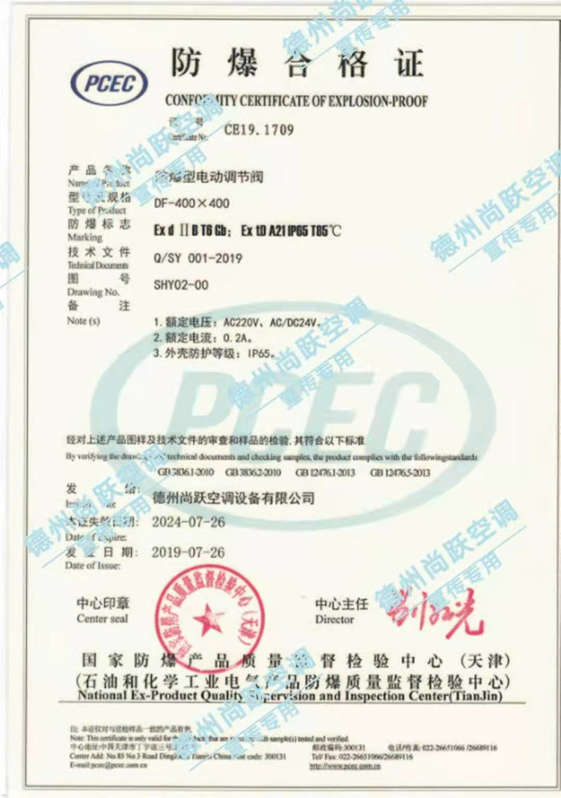 (3)該調節閥分手動、電動(220V,24V),按所用材料分:碳鋼板、鍍鋅板、不銹鋼板三種,防爆調節閥葉片材質為鋁合金,閥體結構及規格尺寸相同。